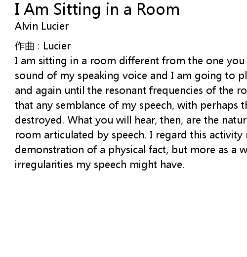 | I am sitting in a room different from the one you are in now. I am recording the sound of my speaking voice and I am going to play it back into the room again and again until the resonant frequencies of the room reinforce themselves so that any semblance of my speech, with perhaps the exception of rhythm, is destroyed. What you will hear, then, are the natural resonant frequencies of the room articulated by speech. I regard this activity not so much as a demonstration of a physical fact, but more as a way to smooth out any irregularities my speech might have. |