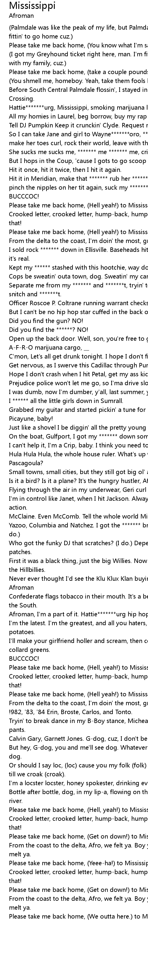 Please take me back home, (take a couple pounds of this *******) to Mississippi. |
