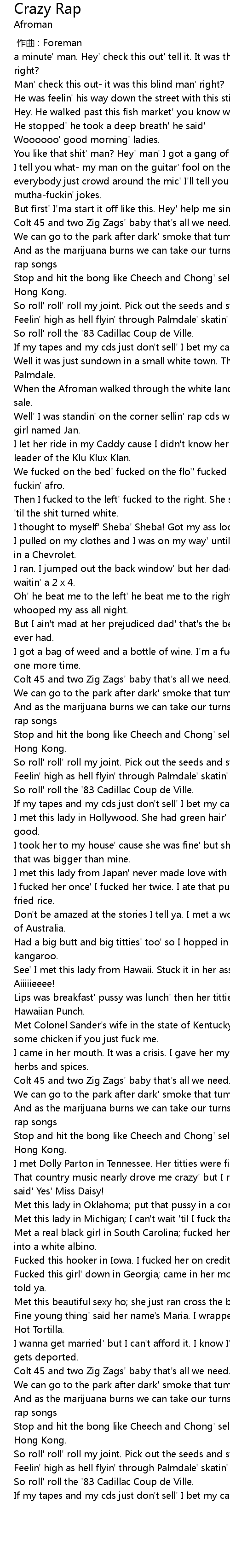| [04:20.65] | Met a real black girl in South Carolina fucked her ' til she turned into a white albino. |