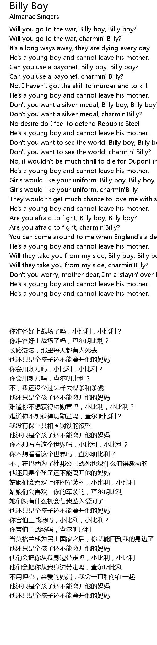 Will you go to the war, Billy boy, Billy boy? |