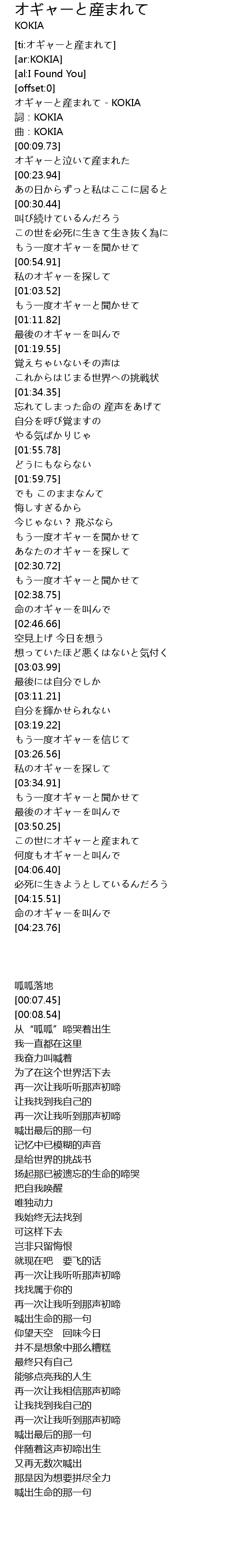 | [00:02.73] | オギャーと産まれて - KOKIA |