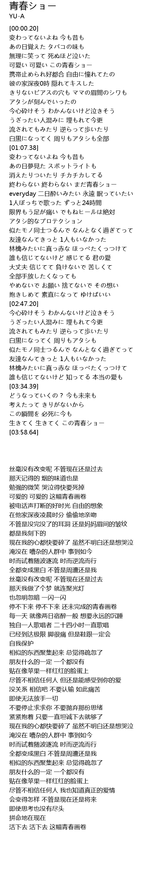 | [03:52.28] | 生きてく 生きてく この青春ショー |