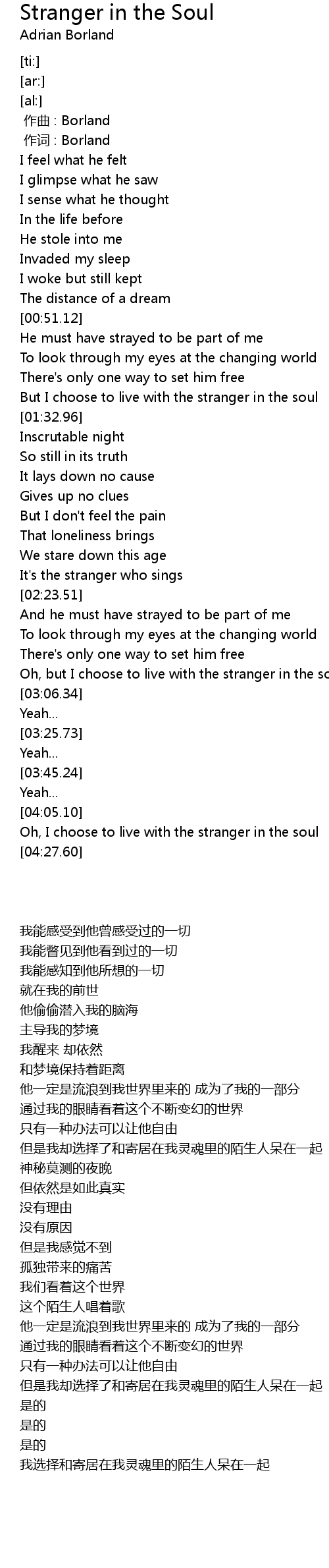 | [04:14.36] | Oh, I choose to live with the stranger in the soul |