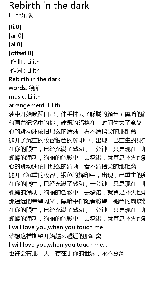 | [00:27.55] | 梦中开始唤醒自己,伸手抹去了朦胧的颜色(黑暗的颜色) |