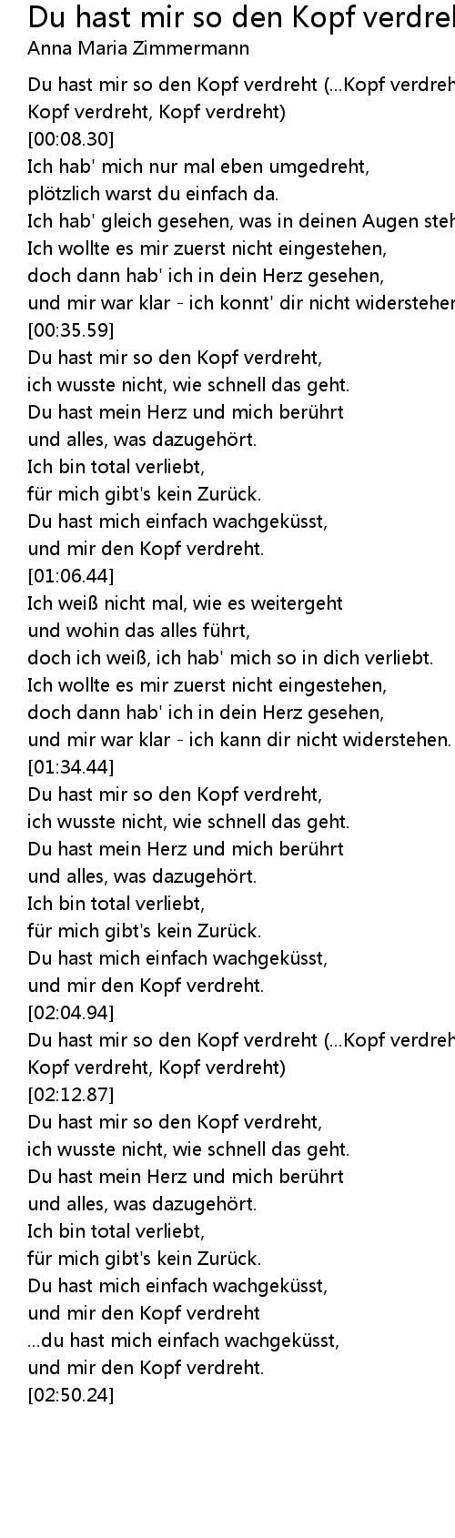 | [00:02.96] | Du hast mir so den Kopf verdreht ... Kopf verdreht, Kopf verdreht, Kopf verdreht, Kopf verdreht |