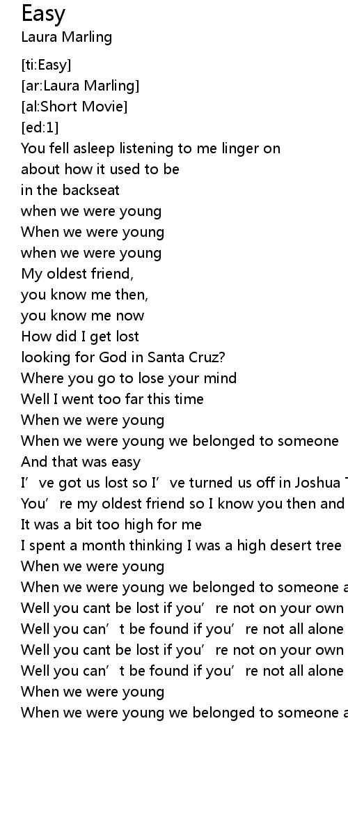 | [02:26.718] | When we were young we belonged to someone and that was easy |