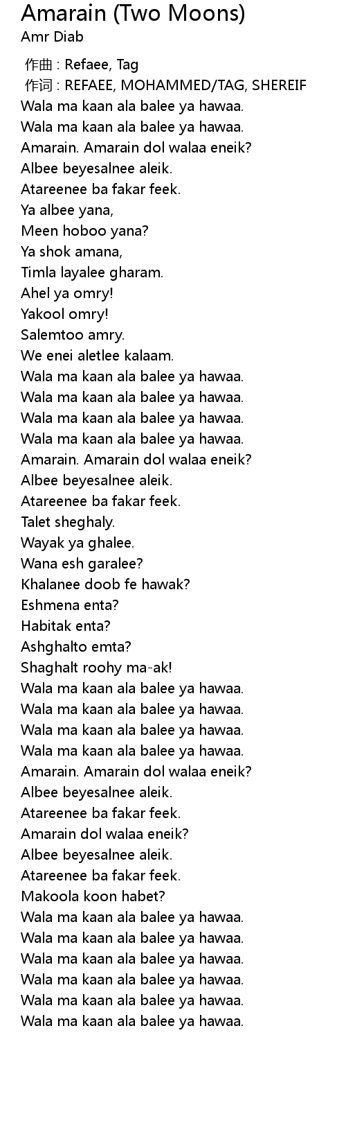 | [02:36.70] | Wala ma kaan ala balee ya hawaa. |