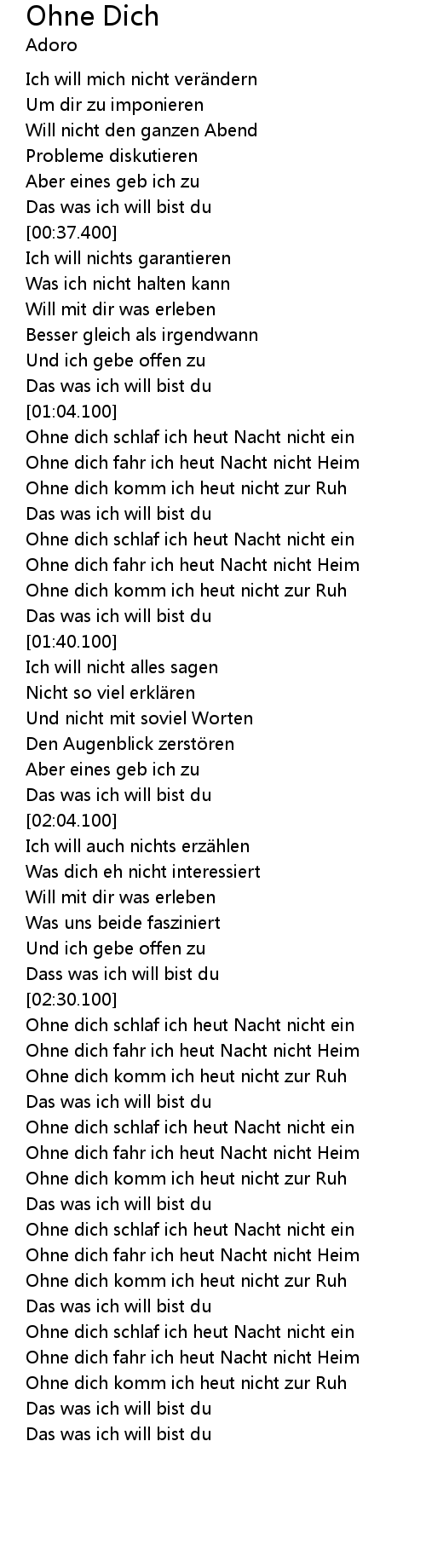 | [03:28.400] | Ohne dich komm ich heut nicht zur Ruh |