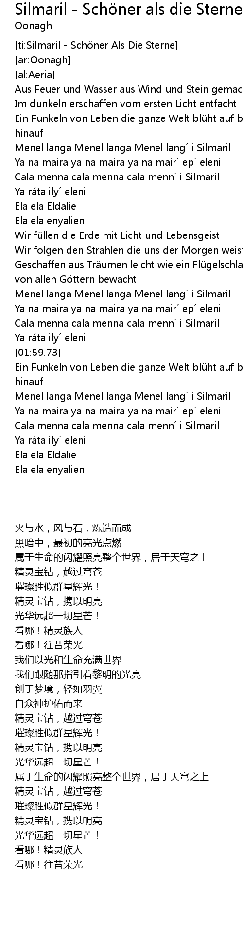 | [01:38.50] | Menel langa Menel langa Menel lang´ i Silmaril |