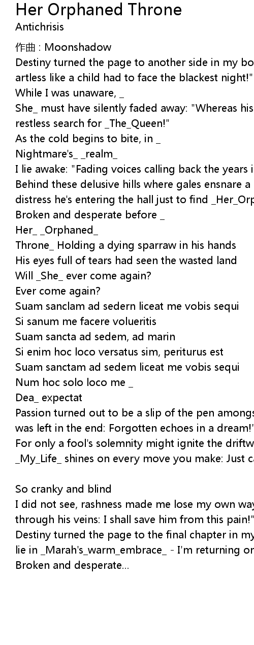 | Behind these delusive hills where gales ensnare a paralyzed sun: " In sombre distress he' s entering the hall just to find _Her_Orphaned_Throne!" | |