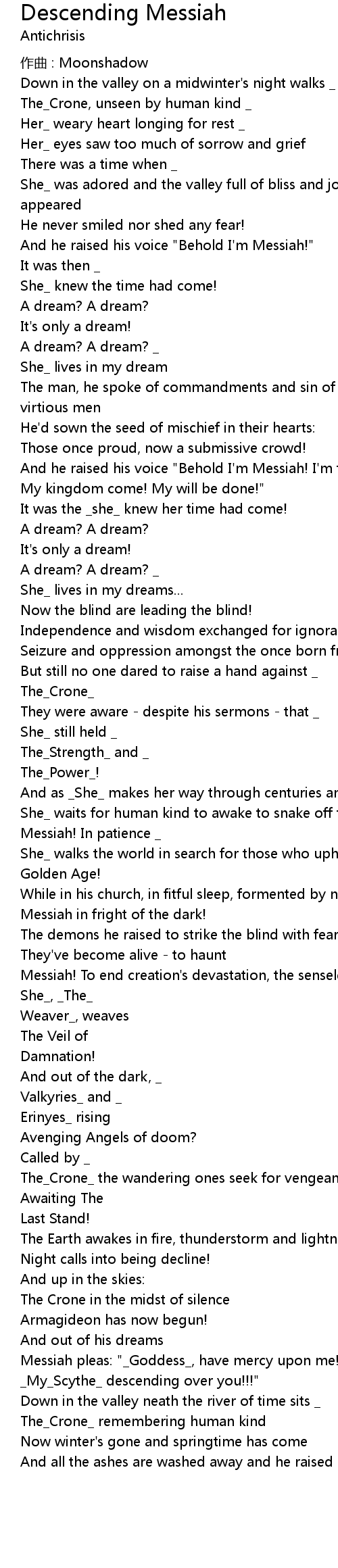 | Messiah! To end creation' s devastation, the senseless sacrifice _ | |