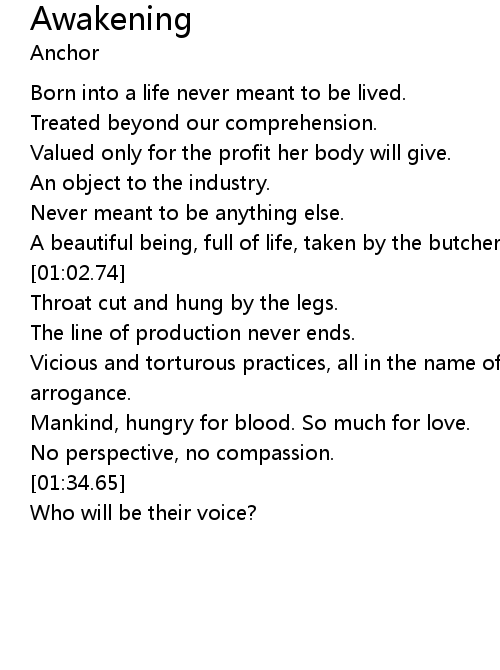 | [00:32.37] | A beautiful being, full of life, taken by the butcher's knife. |