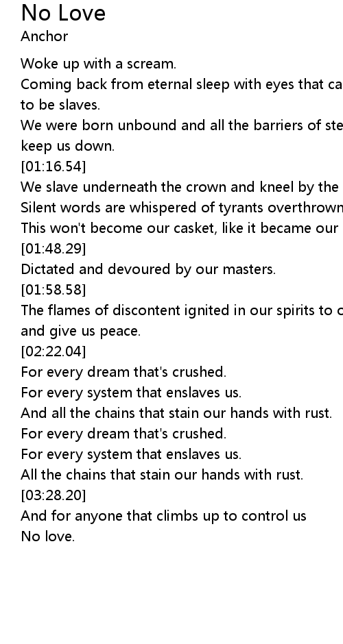 | [00:57.79] | Coming back from eternal sleep with eyes that can see we're not meant to be slaves. |