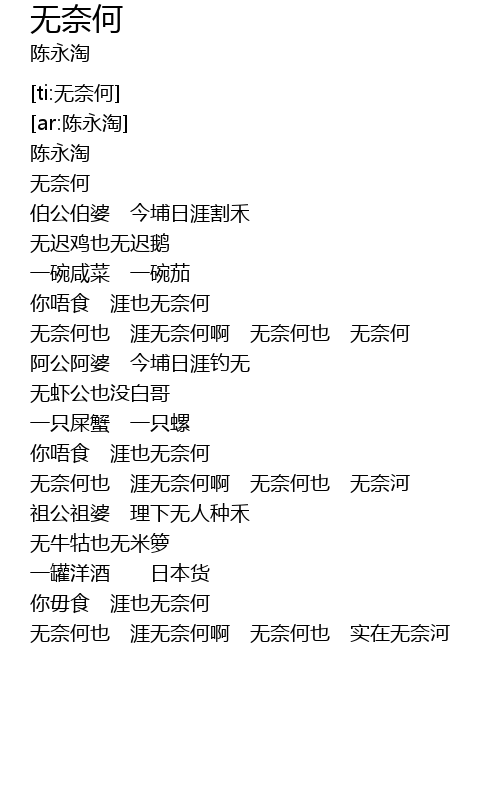| [02:16.02] | 无奈何也 涯无奈何啊 无奈何也 实在无奈河 |