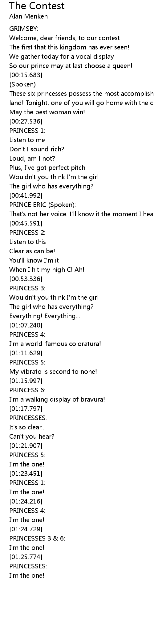 [00:17.239] These six princesses possess the most accomplished voices in all the land! Tonight, one of you will go home with the crown!