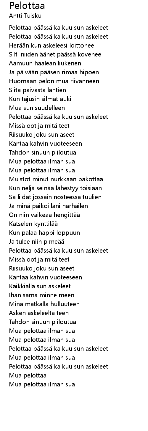 | [00:16.68] | Pelottaa päässä kaikuu sun askeleet |