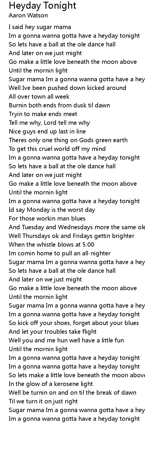 Sugar mama Im a gonna wanna gotta have a heyday tonight |