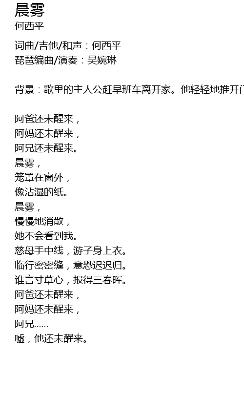 | 背景:歌里的主人公赶早班车离开家。他轻轻地推开门,不想吵醒还在睡梦中的亲人。此刻晨雾未散,街上行人稀少,父母临行前夜的叮嘱还在耳畔回绕。也许这般百感交集的味道,就叫做家。 | |