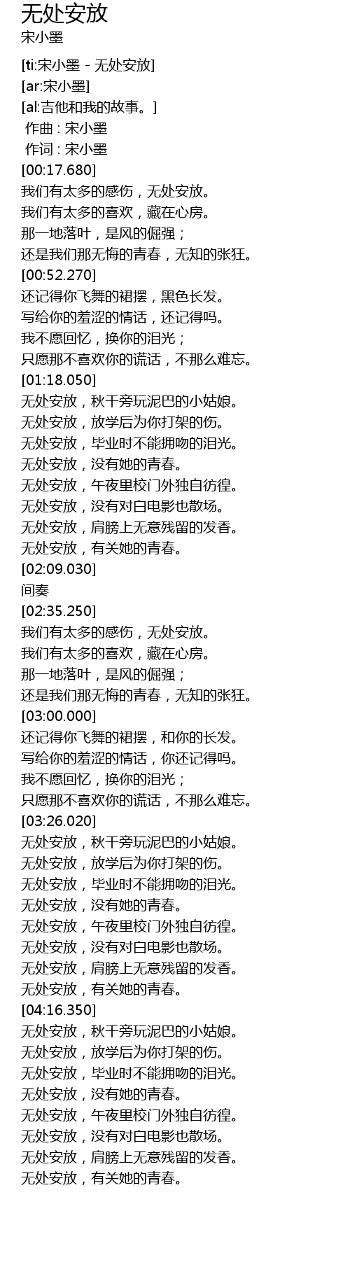 | [04:11.010] | wú chǔ ān fàng, yǒu guān tā de qīng chūn. |