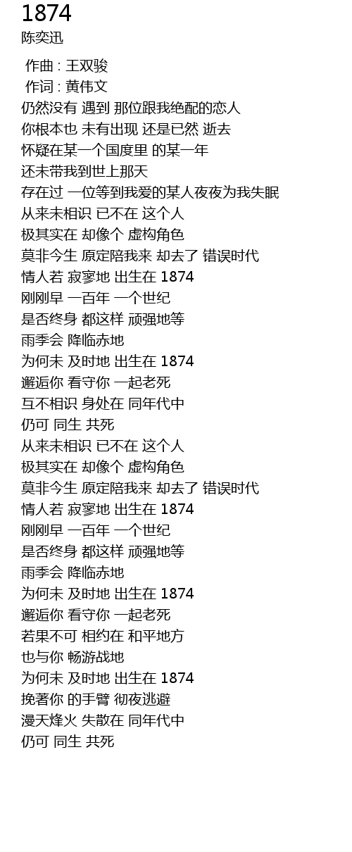 | [01:39.600] | 为何未 及时地 出生在 1874 |