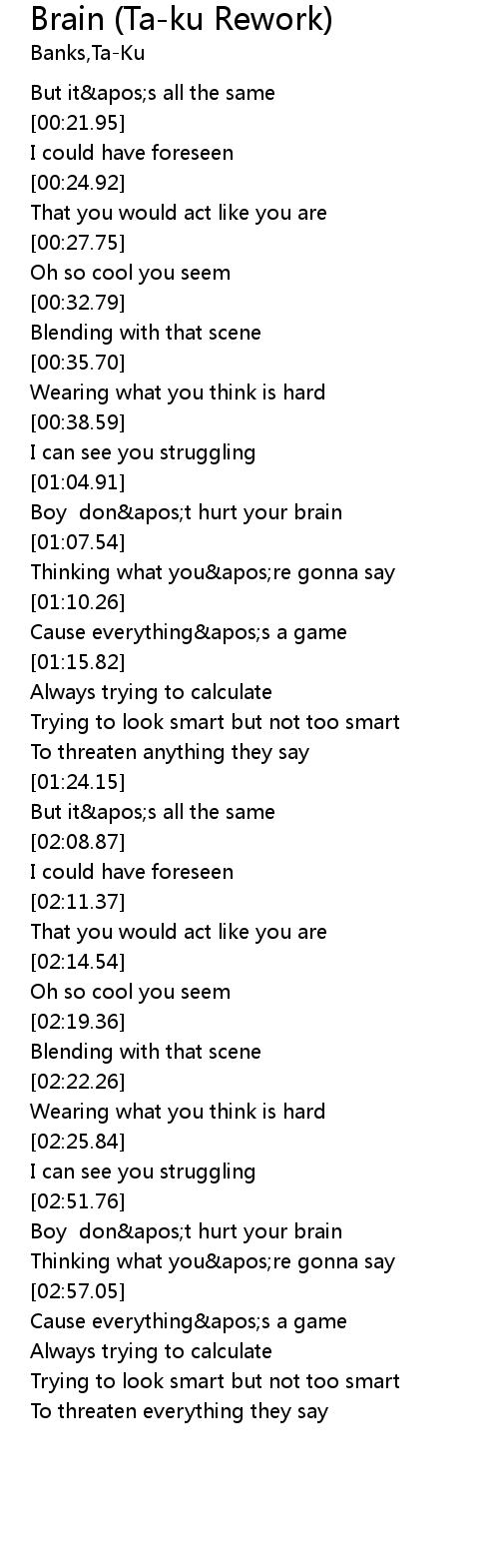 | [01:05.89] | Boy don't hurt your brain |