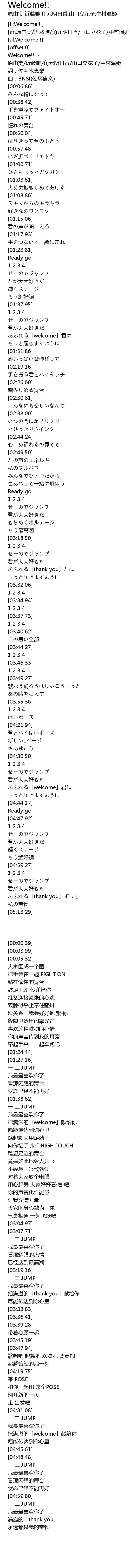 | [00:00.39] | Welcome!! - 原由実/近藤唯/角元明日香/山口立花子/中村温姫 |