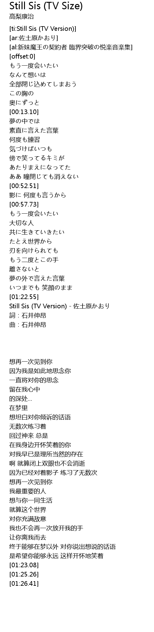 | [01:23.08] | Still Sis (TV Version) - 佐土原かおり |