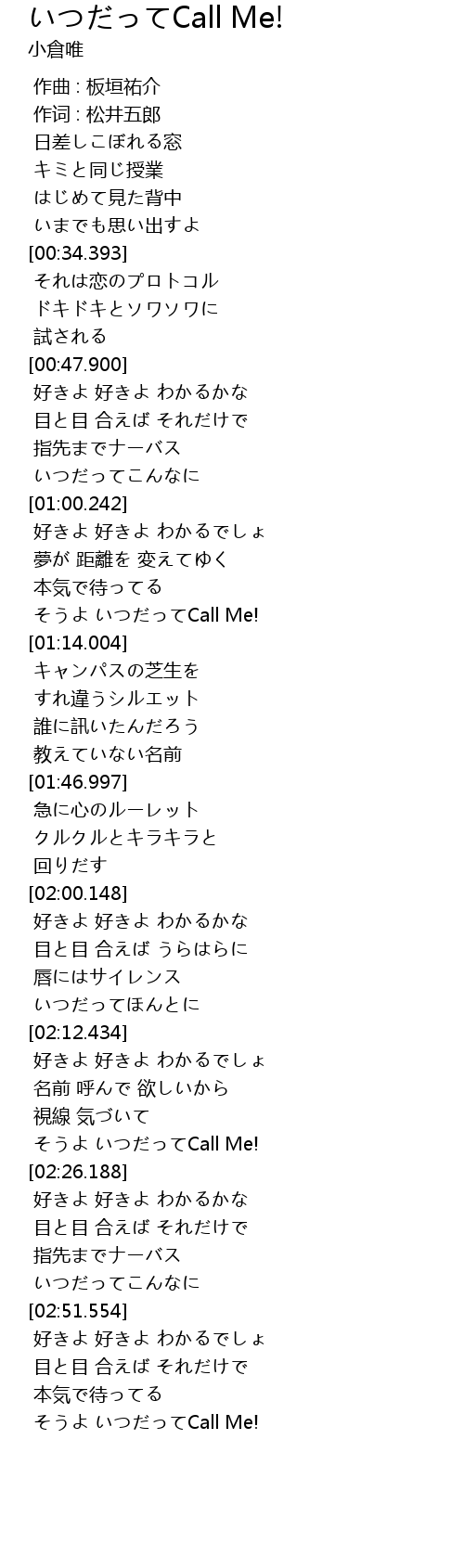 | [01:09.227] | そうよ いつだってCall Me! |