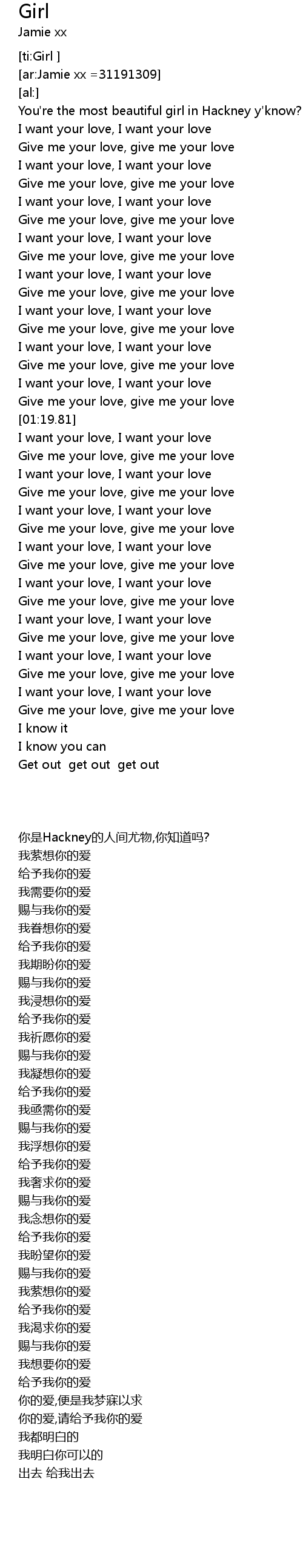 | [00:01.20] | You're the most beautiful girl in Hackney y'know? |