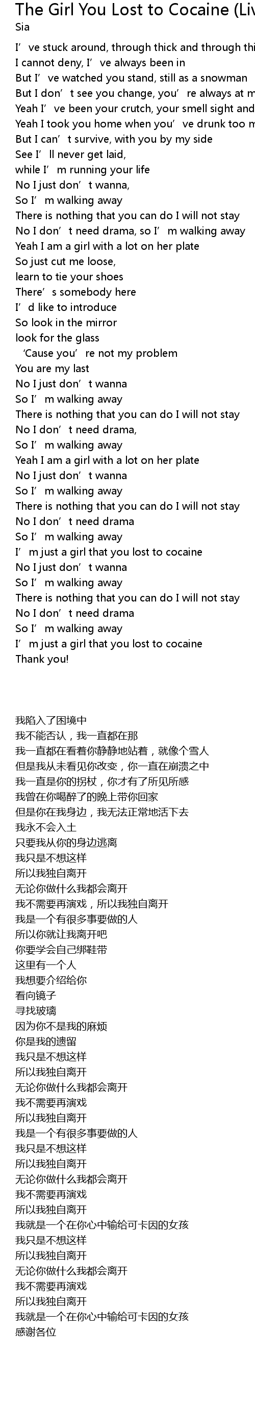 | [02:43.030] | I' m just a girl that you lost to cocaine |