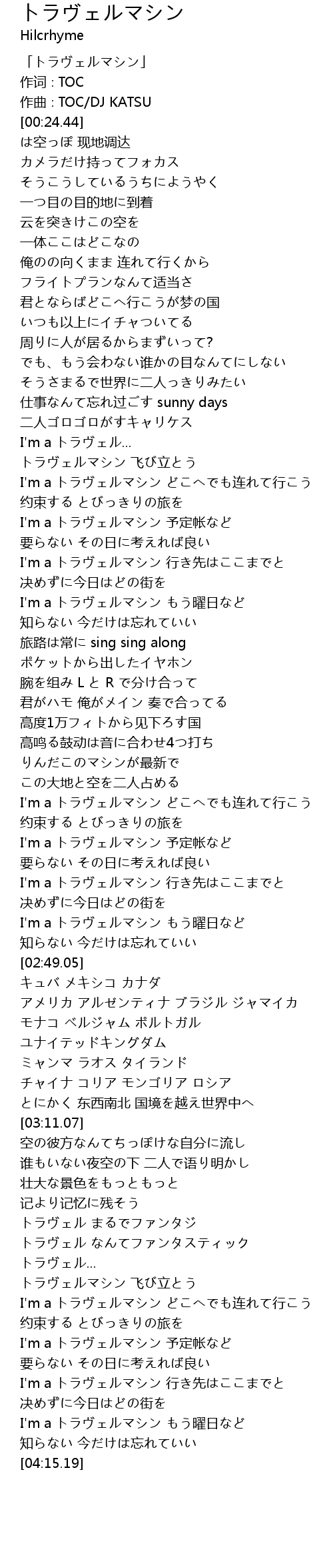 | [03:59.45] | I'm a トラヴェルマシン 行き先はここまでと |