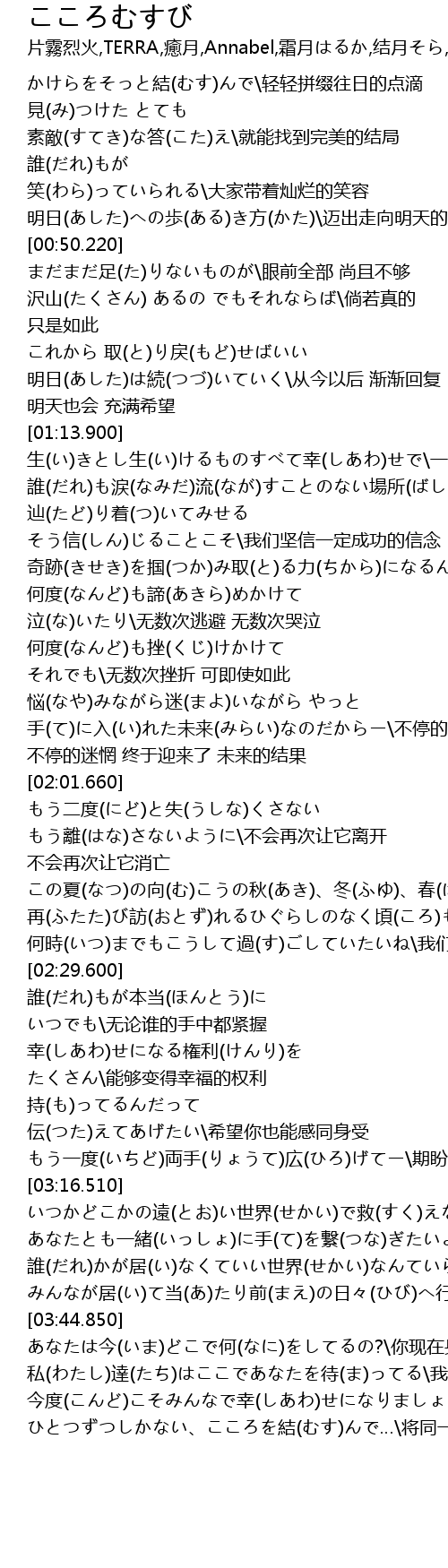 | [05:14.830] | ひとつずつしかない、こころを結(むす)んで…\将同一个心愿紧握 |