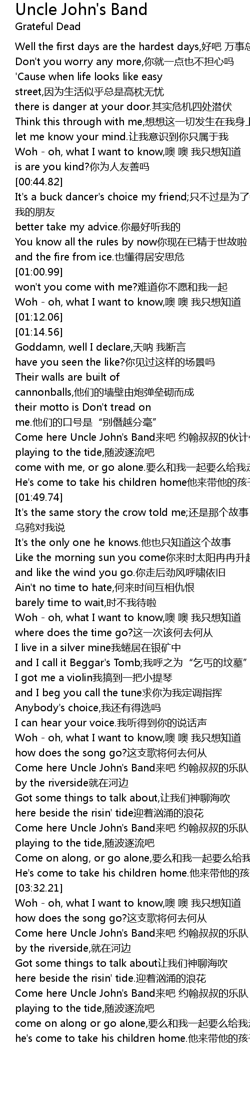 | [03:01.67] | Come here Uncle John's Band来吧 约翰叔叔的乐队 |