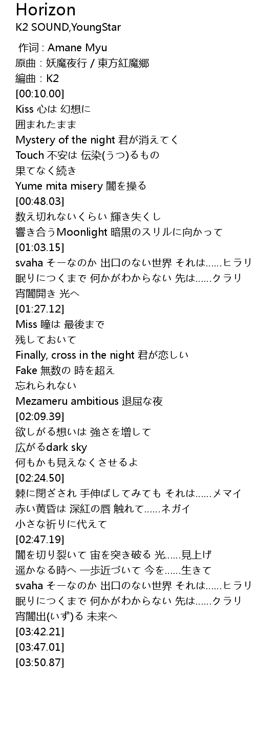 | [03:35.33] | 宵闇出(いず)る 未来へ |