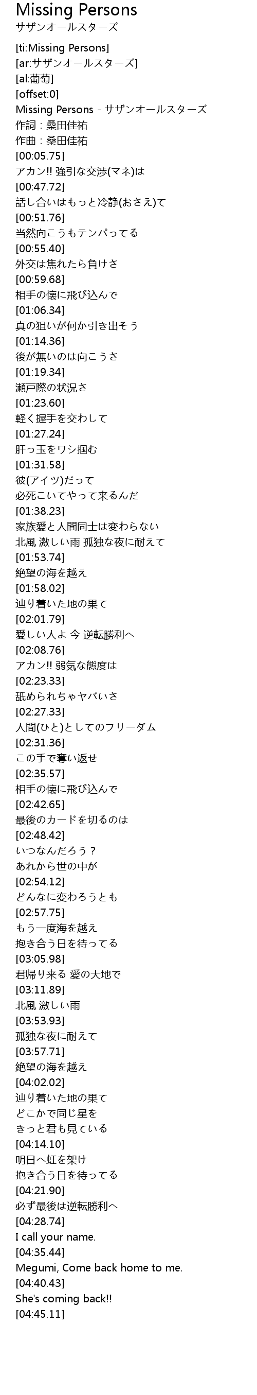 | [00:00.93] | Missing Persons - サザンオールスターズ |
