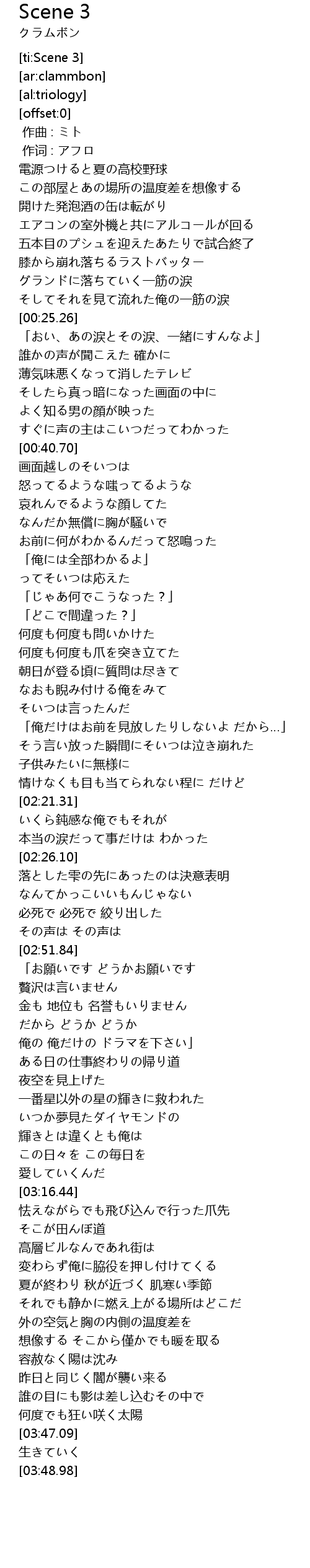 | [03:28.94] | 変わらず俺に脇役を押し付けてくる |
