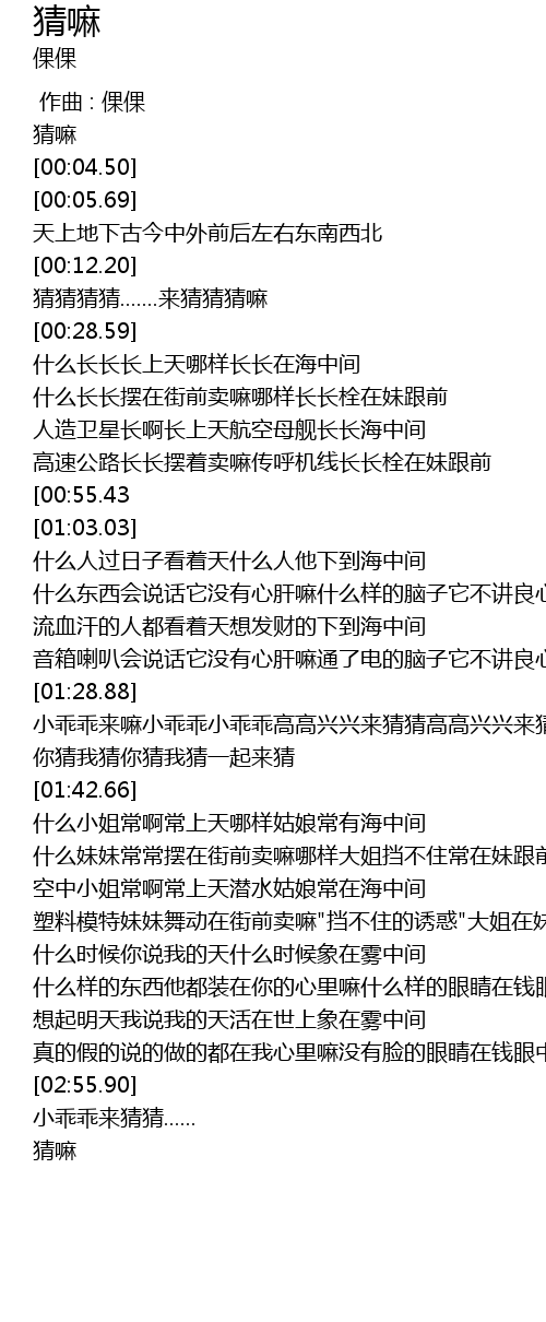 | [01:36.48] | 你猜我猜你猜我猜一起来猜 |