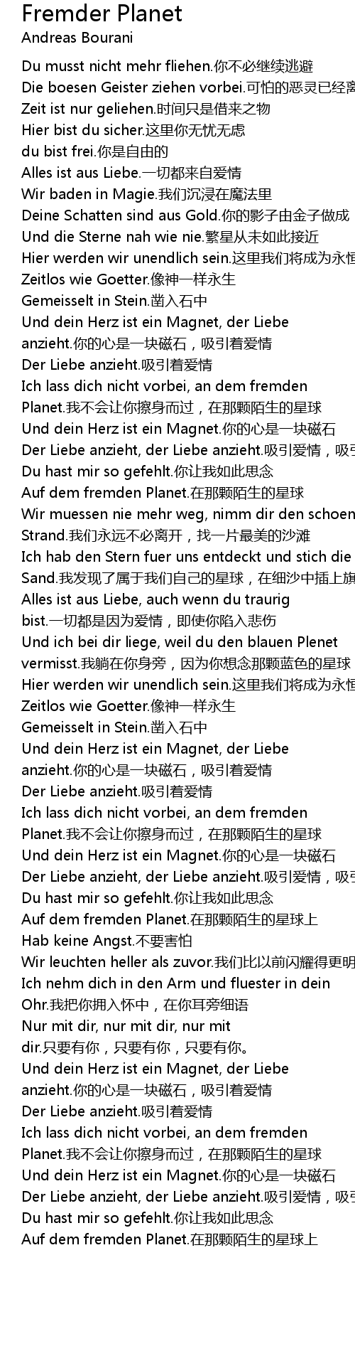 | Ich lass dich nicht vorbei, an dem fremden Planet.我不会让你擦身而过,在那颗陌生的星球 | |