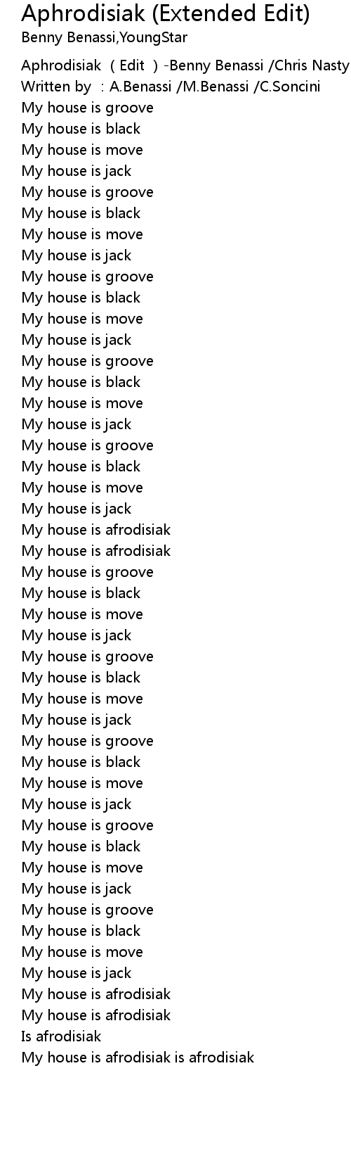 | [00:00.00] | Aphrodisiak (Edit )-Benny Benassi /Chris Nasty |