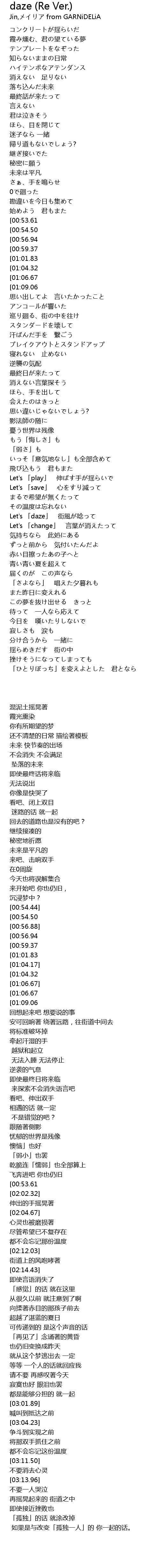 | [03:11.49][01:04.32] | Let's 「daze」 心を消さないで |