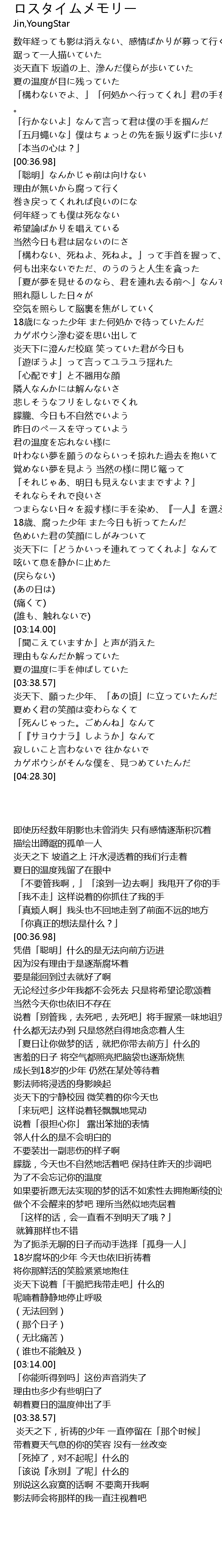 | [03:57.74] | 炎天下、願った少年、「あの頃」に立っていたんだ |