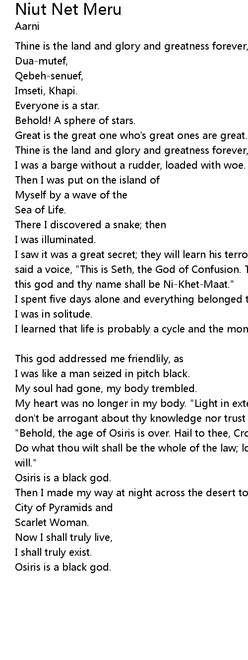 | My heart was no longer in my body. "Light in extension! No-one is born wise, don't be arrogant about thy knowledge nor trust that thou art one who knoweth." "Behold, the age of Osiris is over. Hail to thee, Crowned and Conquering Child! Do what thou wilt shall be the whole of the law; love is the law, love under will." | |