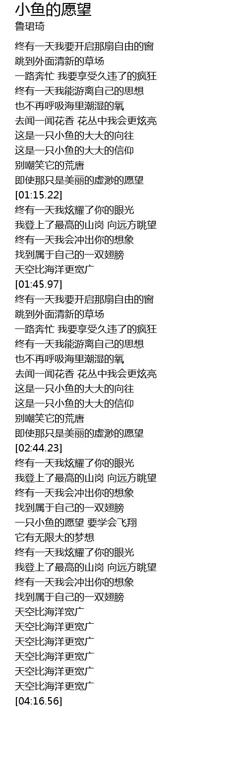 | [03:11.30] | 一只小鱼的愿望 要学会飞翔 |
