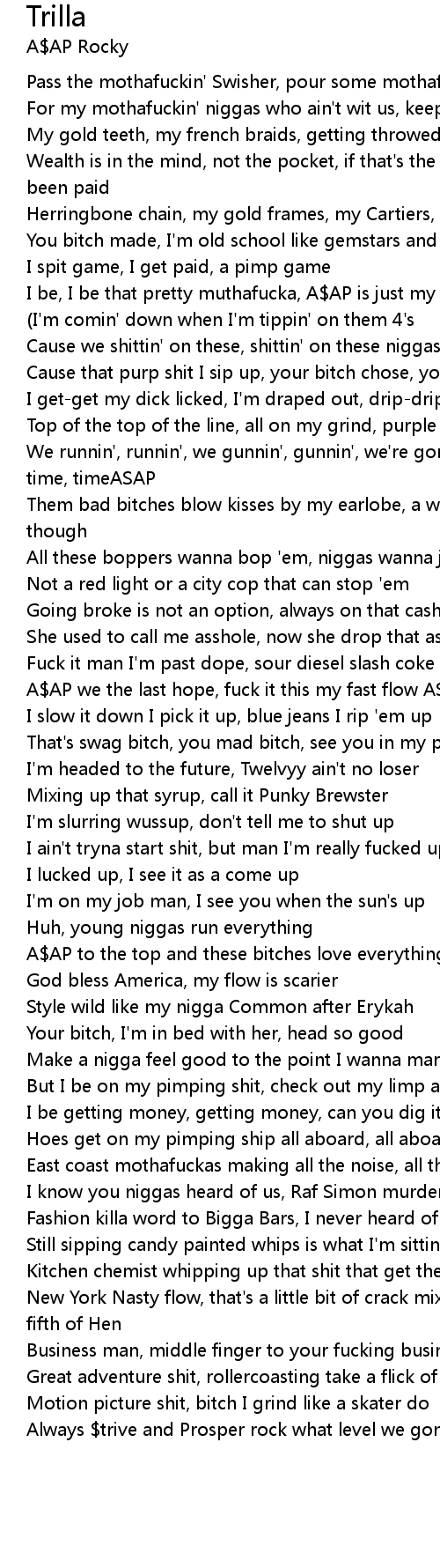 | [00:30.250] | For my mothafuckin' niggas who ain't wit us, keep it trilla |