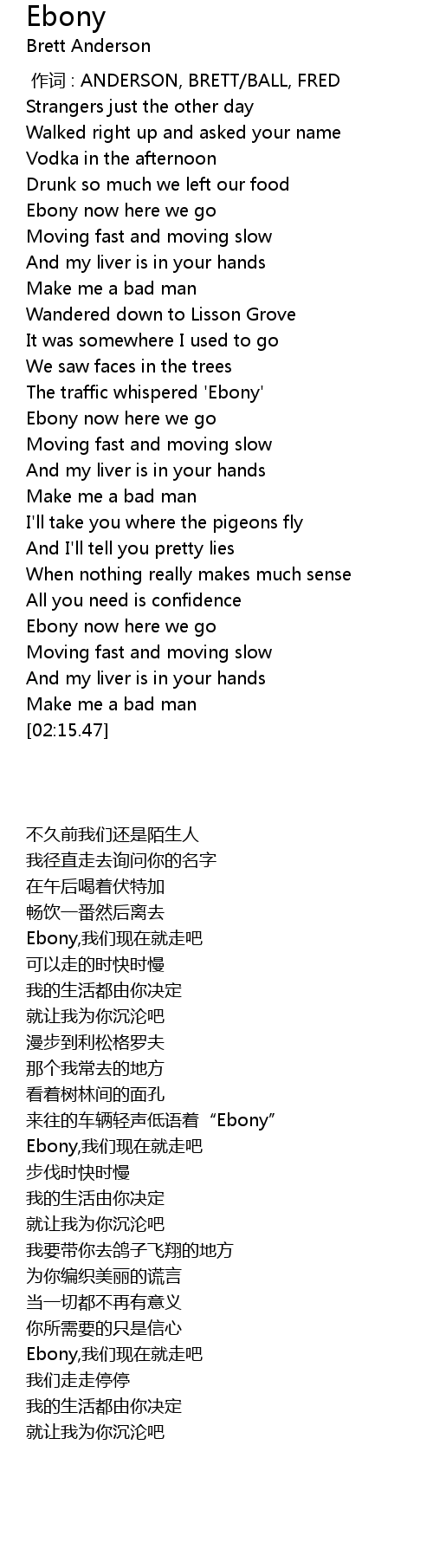 | [01:00.29] | The traffic whispered 'Ebony' |