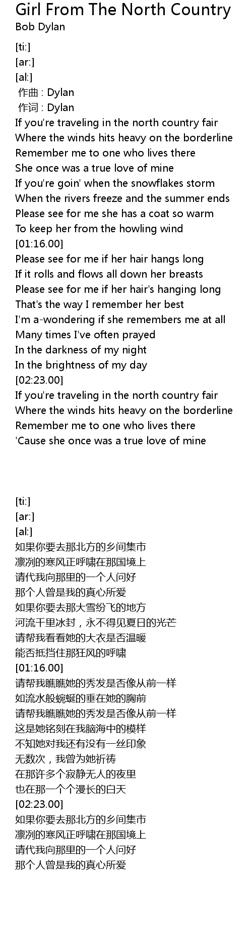 | [01:36.00] | Please see for me if her hair' s hanging long |