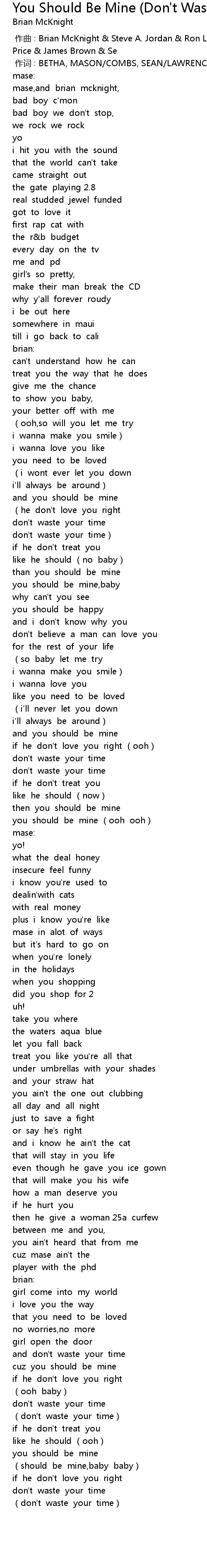 | [00:01.00] | 作词 : BETHA, MASON/COMBS, SEAN/LAWRENCE, RON/PRICE, KELLY |