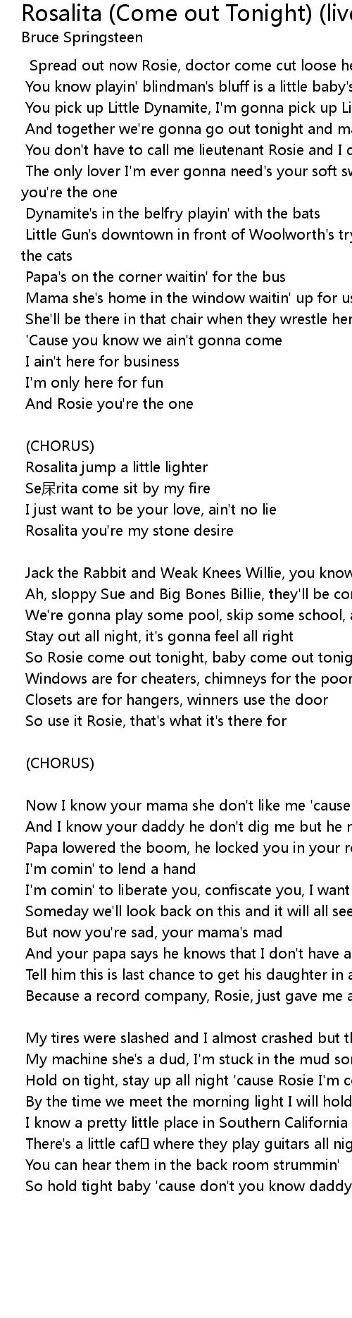 | So Rosie come out tonight, baby come out tonight | |