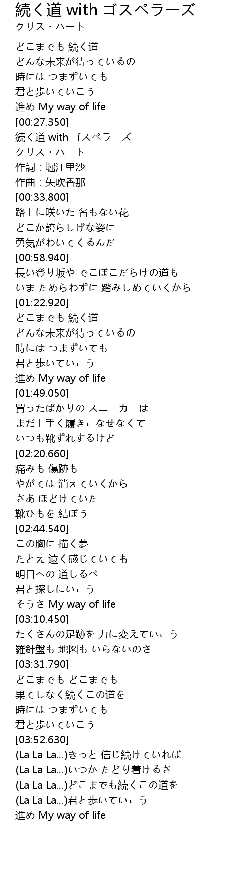 | [00:29.150] | 続く道 with ゴスペラーズ |