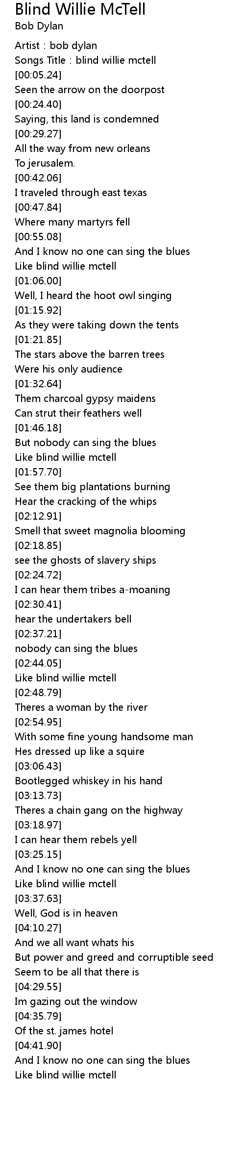 | [04:49.83] | Like blind willie mctell |